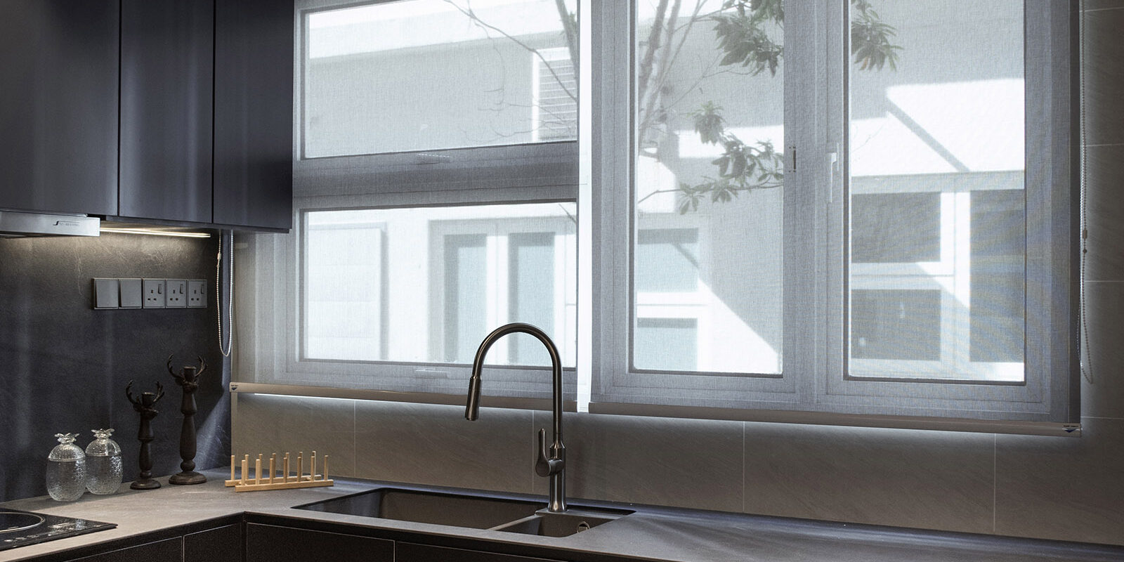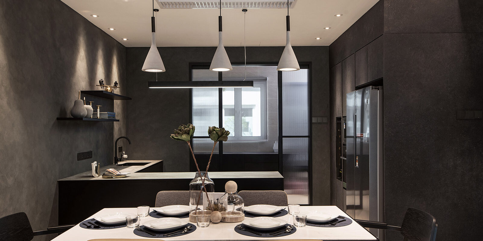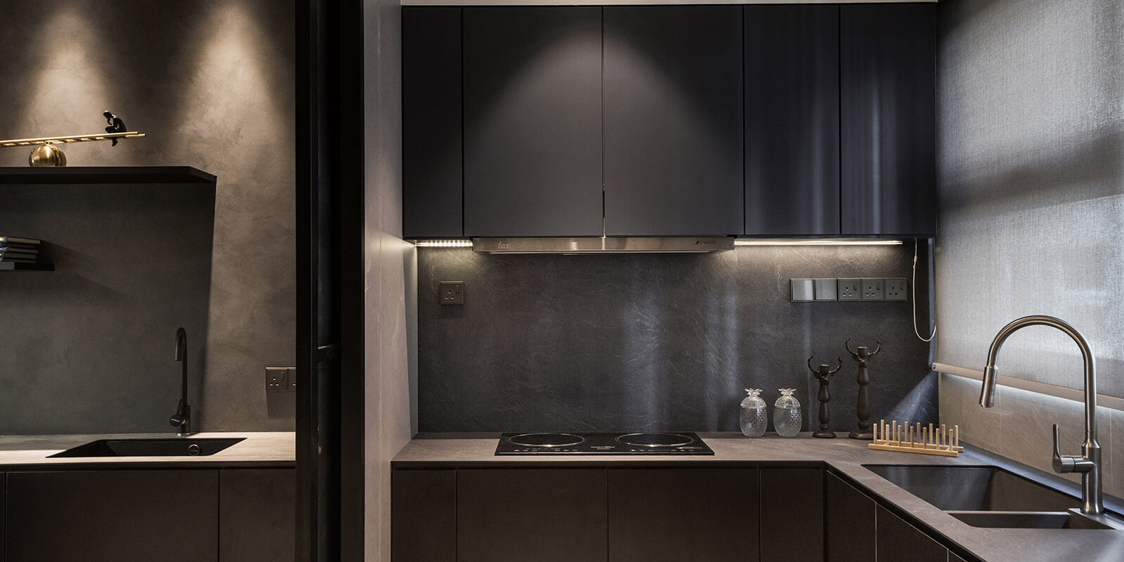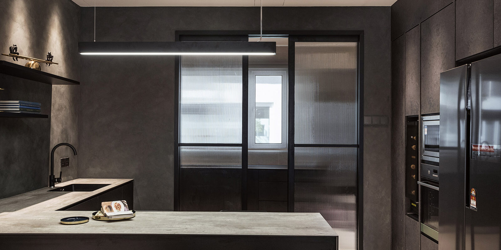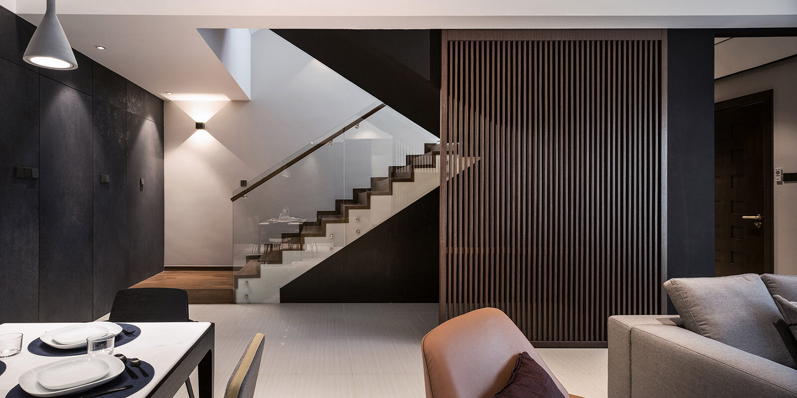 From the outset, the clients made it clear that they valued fresh and intriguing approaches to layout with good aesthetic and sensibilities. Silence, and absolutely snug and cozy are set as principles to showcase an oasis of comfort and style right in the heart of urban chaos. The main living spaces and master en-suite imbued with a series of slate grey materials, when the light poured in through the windows it washed over the surfaces with abandon. On the contrary, the kids and playroom painted with a magic, a whimsy, a vibrancy of color that contrasts neatly with the artful approach in the rest of the home. The dialogue between solid and void, between monotone and vibrancy, between active and static plays a drama within the space while the colors and textures of materials sing the ultimate high tone for the show.