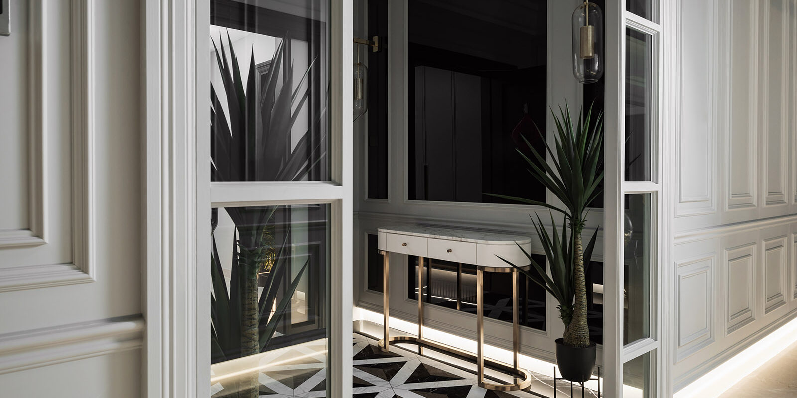 A fascinating feature is added on the ceiling – the mirror plane to create an illusion and perception of a double height volume. Once more, visually maximization of the space volume is elaborated.